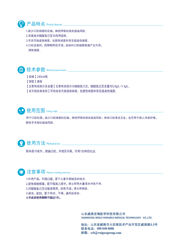 1.減少口腔細菌的定植,降低呼吸機相關感染風險。2.殺菌成分醋酸氯己定為藥用級別。3.可殺滅腸道致病菌、化膿性球菌和常見感染性細菌。4.口腔含漱時,藥物吸附在牙齒、斑塊和口腔黏膜表面產生作用,清除細菌。