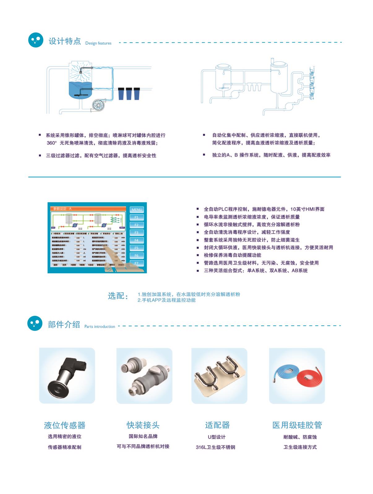 自動化集中配制、供應透析濃縮液,直接聯機使用,簡化配液程序,提高血液透析濃縮液及透析質量